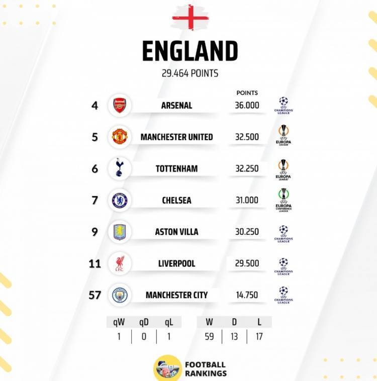 直播吧6月6日讯 2024-25赛季的欧战赛事已全部结束,数据机构Football Rankings公布了英超球队欧战积分排名情况,阿森纳以36分位居全欧第4,5队进入前10,利物浦第11位,曼城仅位居第57位。